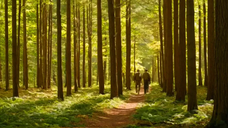 Un caminante en un majestuoso bosque iluminado