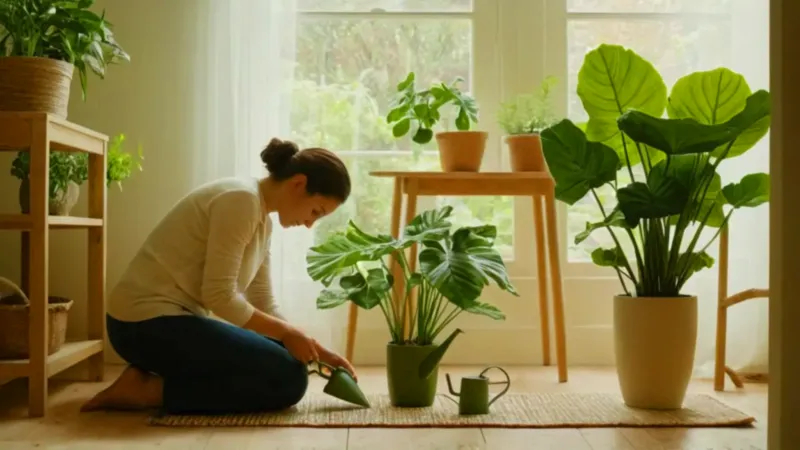 Cuidando una planta en un cuarto soleado