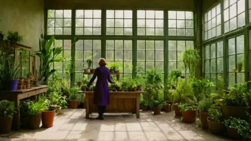 Persona cuidando una planta en el invernadero