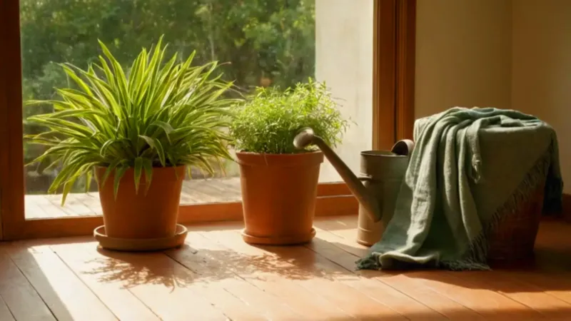 Persona cuidando plantas en una habitación soleada