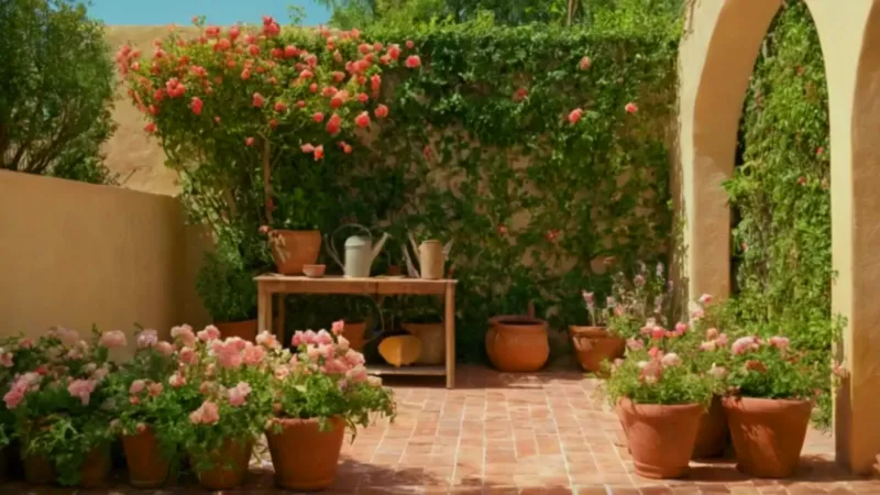 Cuidando flores en un patio soleado