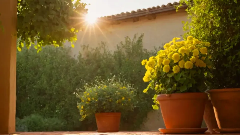 Alguien cuida plantas en un patio soleado